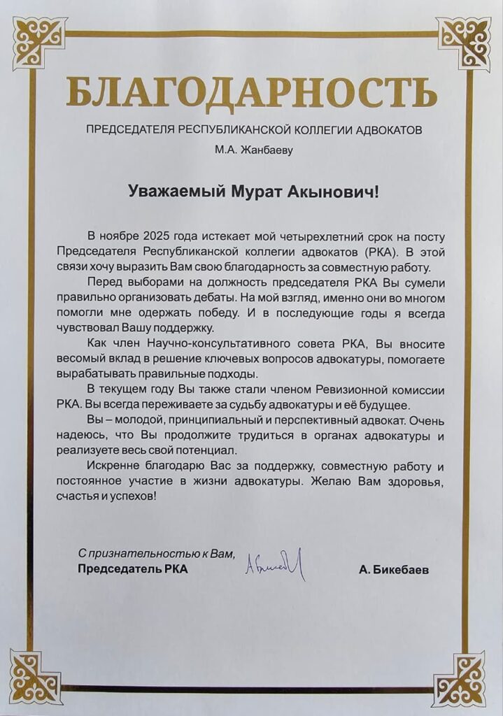 21 ноября в ходе Республиканской конференции коллегий адвокатов адвокату Мурату Акыновичу Жанбаеву выражена Благодарность Председателя Республиканской коллегии адвокатов за совместную работу и постоянное участие и решение ключевых вопросов в жизни адвокатуры.